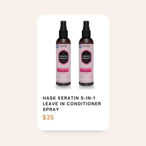Keratin-enriched conditioning spray moisturizes, smooths, detangles, and fortifies hair while providing heat protection up to 400°F.